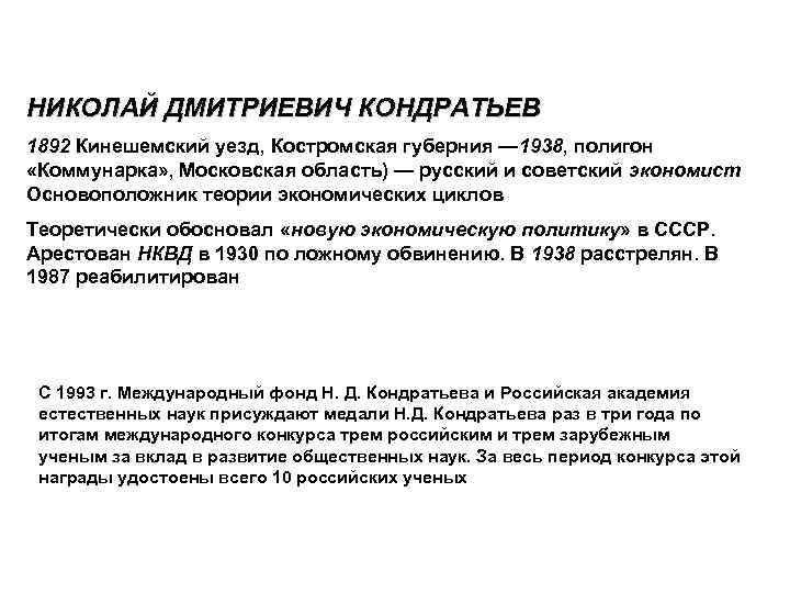 НИКОЛАЙ ДМИТРИЕВИЧ КОНДРАТЬЕВ 1892 Кинешемский уезд, Костромская губерния — 1938, полигон «Коммунарка» , Московская область) — русский и советский экономист Основоположник теории экономических циклов Теоретически обосновал «новую экономическую политику» в СССР. Арестован НКВД в 1930 по ложному обвинению. В 1938 расстрелян. В 1987 реабилитирован С 1993 г. Международный фонд Н. Д. Кондратьева и Российская академия естественных наук присуждают медали Н. Д. Кондратьева раз в три года по итогам международного конкурса трем российским и трем зарубежным ученым за вклад в развитие общественных наук. За весь период конкурса этой награды удостоены всего 10 российских ученых