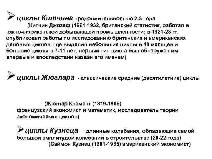 Øциклы Китчина продолжительностью 2 -3 года (Китчин Джозеф (1861 -1932, британский статистик, работал в Китчин Джозеф ( южно-африканской добывающей промышленности; в 1921 -23 гг. опубликовал работы по исследованию британских и американских деловых циклов, где выделил небольшие циклы в 40 месяцев и большие циклы в 7 -11 лет; первый тип цикла был обнаружен им впервые и впоследствии назван его именем) Øциклы Жюглара - классические средние (десятилетние) циклы (Жюглар Клемент (1819 -1908) Жюглар Клемент французский экономист и математик, исследователь теории экономических циклов) Øциклы Кузнеца – длинные колебания, обладающие самой большой амплитудой колебаний в строительстве (20 -22 года) (Саймон Кузнец (1901 -1985) американский экономист) Саймон Кузнец