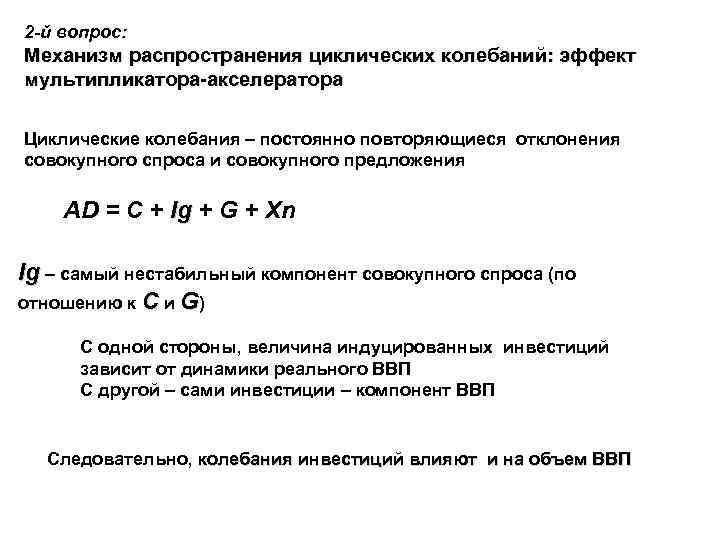 2 -й вопрос: Механизм распространения циклических колебаний: эффект мультипликатора-акселератора Циклические колебания – постоянно повторяющиеся отклонения совокупного спроса и совокупного предложения AD = C + Ig + G + Xn Ig – самый нестабильный компонент совокупного спроса (по отношению к С и G) С одной стороны, величина индуцированных инвестиций зависит от динамики реального ВВП С другой – сами инвестиции – компонент ВВП Следовательно, колебания инвестиций влияют и на объем ВВП