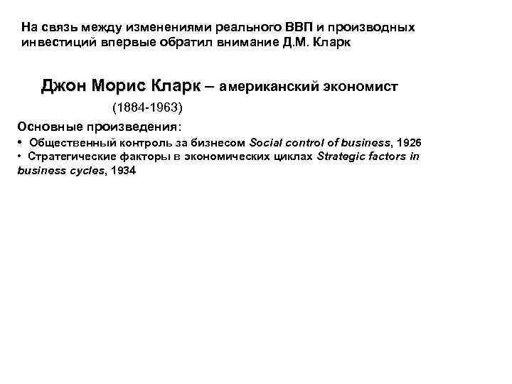 На связь между изменениями реального ВВП и производных инвестиций впервые обратил внимание Д. М. Кларк Джон Морис Кларк – американский экономист (1884 -1963) Основные произведения: • Общественный контроль за бизнесом Social control of business, 1926 • Стратегические факторы в экономических циклах Strategic factors in business cycles, 1934