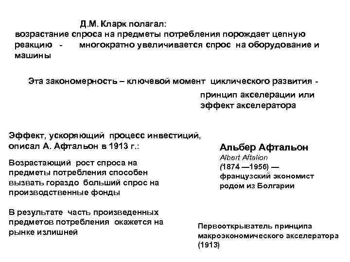 Д. М. Кларк полагал: возрастание спроса на предметы потребления порождает цепную реакцию - многократно увеличивается спрос на оборудование и машины Эта закономерность – ключевой момент циклического развития - принцип акселерации или эффект акселератора Эффект, ускоряющий процесс инвестиций, описал А. Афтальон в 1913 г. : Альбер Афтальон Albert Aftalion Возрастающий рост спроса на (1874 — 1956) — предметы потребления способен французский экономист вызвать гораздо больший спрос на родом из Болгарии производственные фонды В результате часть произведенных предметов потребления окажется на Первооткрыватель принципа рынке излишней макроэкономического акселератора (1913)