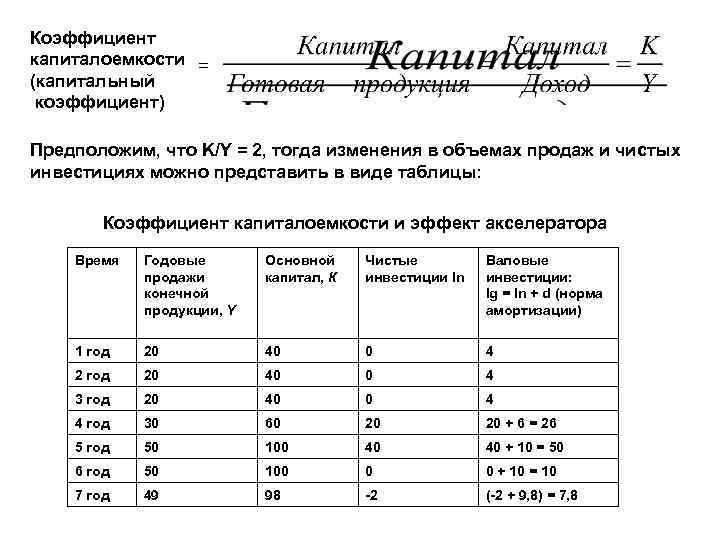 Коэффициент капиталоемкости = (капитальный коэффициент) Предположим, что K/Y = 2, тогда изменения в объемах продаж и чистых инвестициях можно представить в виде таблицы: Коэффициент капиталоемкости и эффект акселератора Время Годовые Основной Чистые Валовые продажи капитал, К инвестиции In инвестиции: конечной Ig = In + d (норма продукции, Y амортизации) 1 год 20 40 0 4 2 год 20 40 0 4 3 год 20 40 0 4 4 год 30 60 20 + 6 = 26 5 год 50 100 40 + 10 = 50 6 год 50 100 0 + 10 = 10 7 год 49 98 -2 (-2 + 9, 8) = 7, 8