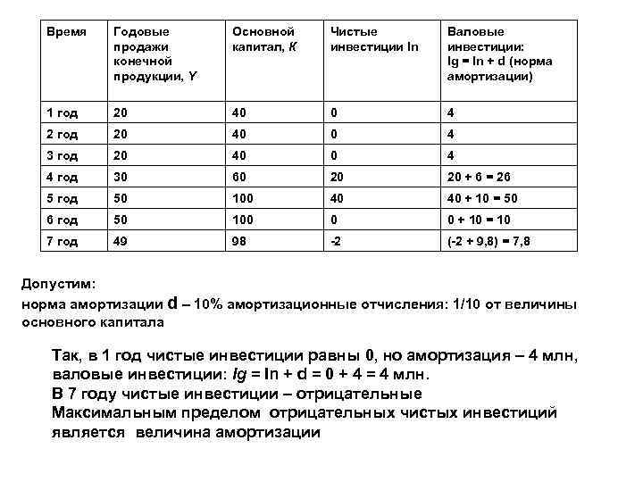 Время Годовые Основной Чистые Валовые продажи капитал, К инвестиции In инвестиции: конечной Ig = In + d (норма продукции, Y амортизации) 1 год 20 40 0 4 2 год 20 40 0 4 3 год 20 40 0 4 4 год 30 60 20 + 6 = 26 5 год 50 100 40 + 10 = 50 6 год 50 100 0 + 10 = 10 7 год 49 98 -2 (-2 + 9, 8) = 7, 8 Допустим: норма амортизации d – 10% амортизационные отчисления: 1/10 от величины основного капитала Так, в 1 год чистые инвестиции равны 0, но амортизация – 4 млн, валовые инвестиции: Ig = In + d = 0 + 4 = 4 млн. В 7 году чистые инвестиции – отрицательные Максимальным пределом отрицательных чистых инвестиций является величина амортизации
