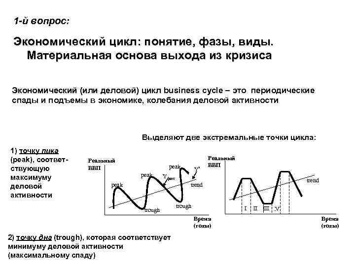 1 -й вопрос: Экономический цикл: понятие, фазы, виды. Материальная основа выхода из кризиса Экономический (или деловой) цикл business cycle – это периодические Экономический (или деловой) цикл спады и подъемы в экономике, колебания деловой активности Выделяют две экстремальные точки цикла: 1) точку пика (peak), соответ- Реальный peak ВВП ствующую ВВП Y* максимуму peak Yфакт trend деловой peak trend активности trough I II IV trough Время (годы) 2) точку дна (trough), которая соответствует минимуму деловой активности (максимальному спаду)