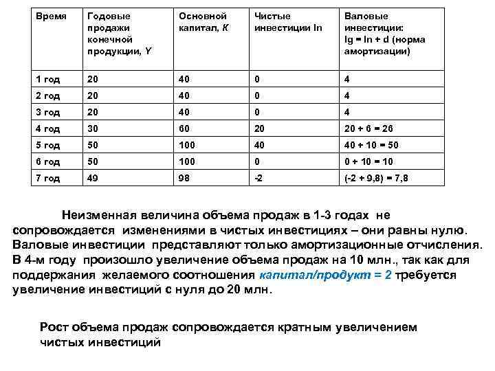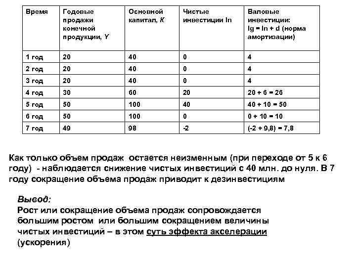 Время Годовые Основной Чистые Валовые продажи капитал, К инвестиции In инвестиции: конечной Ig = In + d (норма продукции, Y амортизации) 1 год 20 40 0 4 2 год 20 40 0 4 3 год 20 40 0 4 4 год 30 60 20 + 6 = 26 5 год 50 100 40 + 10 = 50 6 год 50 100 0 + 10 = 10 7 год 49 98 -2 (-2 + 9, 8) = 7, 8 Неизменная величина объема продаж в 1 -3 годах не сопровождается изменениями в чистых инвестициях – они равны нулю. Валовые инвестиции представляют только амортизационные отчисления. В 4 -м году произошло увеличение объема продаж на 10 млн. , так как для поддержания желаемого соотношения капитал/продукт = 2 требуется увеличение инвестиций с нуля до 20 млн. Рост объема продаж сопровождается кратным увеличением чистых инвестиций