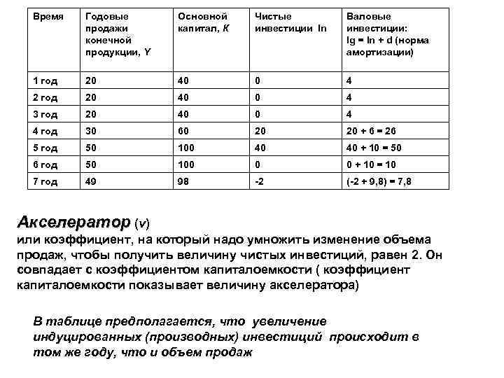 Время Годовые Основной Чистые Валовые продажи капитал, К инвестиции In инвестиции: конечной Ig = In + d (норма продукции, Y амортизации) 1 год 20 40 0 4 2 год 20 40 0 4 3 год 20 40 0 4 4 год 30 60 20 + 6 = 26 5 год 50 100 40 + 10 = 50 6 год 50 100 0 + 10 = 10 7 год 49 98 -2 (-2 + 9, 8) = 7, 8 Акселератор (v) или коэффициент, на который надо умножить изменение объема продаж, чтобы получить величину чистых инвестиций, равен 2. Он совпадает с коэффициентом капиталоемкости ( коэффициент капиталоемкости показывает величину акселератора) В таблице предполагается, что увеличение индуцированных (производных) инвестиций происходит в том же году, что и объем продаж