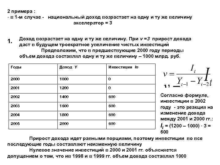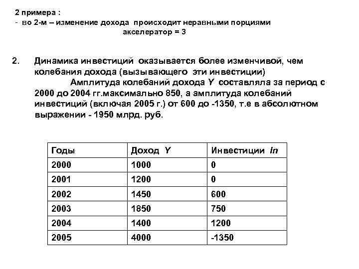 2 примера : - в 1 -м случае - национальный доход возрастает на одну и ту же величину акселератор = 3 Доход возрастает на одну и ту же величину. При v =3 прирост дохода 1. даст в будущем троекратное увеличение чистых инвестиций Предположим, что в предшествующие 2000 году периоды объем дохода составлял одну и ту же величину – 1000 млрд. руб. Годы Доход Y Инвестиции In 2000 1000 0 2001 1200 0 2002 1400 600 Согласно формуле, инвестиции в 2002 2003 1600 году - это реакция на 2004 1800 600 изменение дохода между 2001 и 2000 гг. : 2005 2000 600 It = (1200 – 1000) ∙ 3 = 600 Прирост дохода идет равными порциями, поэтому инвестиции во все последующие годы составляют неизменную величину Нулевое значение инвестиций в 2000 и 2001 гг. объясняется допущением о том, что ив 1998 и в 1999 гг. объем дохода составлял 1000