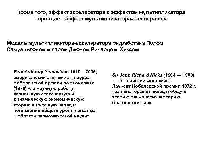 Кроме того, эффект акселератора с эффектом мультипликатора порождает эффект мультипликатора-акселератора Модель мультипликатора-акселератора разработана Полом мультипликатора-акселератора Самуэльсоном и сэром Джоном Ричардом Хиксом Paul Anthony Samuelson 1915 – 2009, американский экономист, лауреат Sir John Richard Hicks (1904 — 1989) Нобелевской премии по экономике — английский экономист. (1970) «за научную работу, Лауреат Нобелевской премии 1972 г. развившую статическую и «за новаторский вклад в общую динамическую экономическую теорию равновесия и теорию и внесшую вклад в благосостояния» повышение общего уровня анализа в области экономической науки»