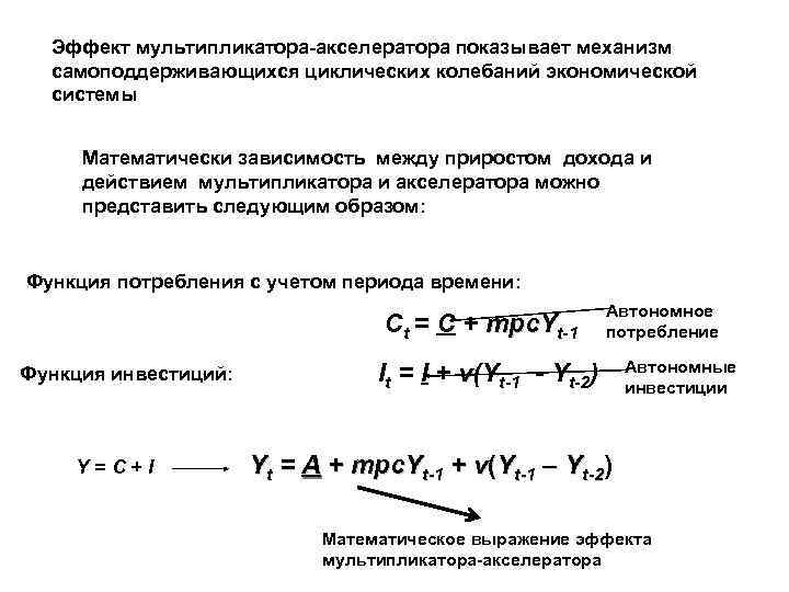 Эффект мультипликатора-акселератора показывает механизм самоподдерживающихся циклических колебаний экономической системы Математически зависимость между приростом дохода и действием мультипликатора и акселератора можно представить следующим образом: Функция потребления с учетом периода времени: Автономное Сt = C + mpc. Yt-1 mpc потребление Функция инвестиций: It = I + v(Yt-1 - Yt-2) Автономные инвестиции Y=C+I Yt = A + mpc. Yt-1 + v(Yt-1 – Yt-2) Математическое выражение эффекта мультипликатора-акселератора