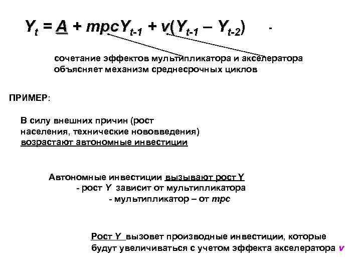 Yt = A + mpc. Yt-1 + v(Yt-1 – Yt-2) - сочетание эффектов мультипликатора и акселератора объясняет механизм среднесрочных циклов ПРИМЕР: В силу внешних причин (рост населения, технические нововведения) возрастают автономные инвестиции Автономные инвестиции вызывают рост Y Автономные инвестиции - рост Y зависит от мультипликатора - мультипликатор – от mpc Рост Y вызовет производные инвестиции, которые производные инвестиции будут увеличиваться с учетом эффекта акселератора v