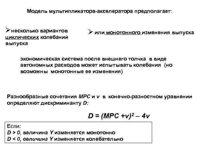 Модель мультипликатора-акселератора предполагает: мультипликатора-акселератора Øнесколько вариантов Ø или монотонного изменения выпуска циклических колебаний выпуска экономическая система после внешнего толчка в виде автономных расходов может испытывать колебания (но возможны монотонные ее изменения) Разнообразные сочетания MPC и v в конечно-разностном уравнении определяют дискриминанту D: D = (MPC +v)2 – 4 v Если: D > 0, величина Y изменяется монотонно 0 D < 0, величина Y изменяется колебательно 0