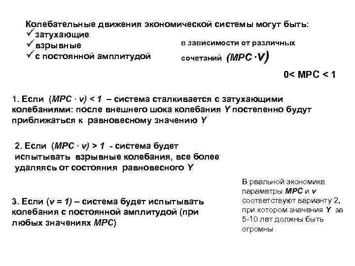 Колебательные движения экономической системы могут быть: üзатухающие üвзрывные в зависимости от различных üс постоянной амплитудой сочетаний (MPC ∙v) 0< МРС < 1 1. Если (MPC ∙ v) < 1 – система сталкивается с затухающими колебаниями: после внешнего шока колебания Y постепенно будут колебаниями: приближаться к равновесному значению Y 2. Если (MPC ∙ v) > 1 - система будет испытывать взрывные колебания, все более взрывные колебания, удаляясь от состояния равновесного Y В реальной экономике параметры MPC и v 3. Если (v = 1) – система будет испытывать соответствуют варианту 2, колебания с постоянной амплитудой (при постоянной амплитудой при котором значения Y за любых значениях МРС) 5 -10 лет должны быть огромны