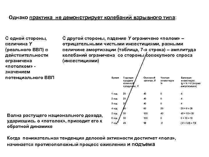 Однако практика не демонстрирует колебаний взрывного типа: С одной стороны, С другой стороны, падение Y ограничено «полом» – величина Y отрицательными чистыми инвестициями, равными (реального ВВП) в величине амортизации (таблица, 7 -я строка) – амплитуда действительности колебаний ограничена со стороны совокупного спроса ограничена (инвестициями) «потолком» - значением потенциального ВВП Время Годовые Основной Чистые Валовые продажи капитал, К инвестиции: конечной In Ig = In + d (норма продукции, Y амортизации) 1 год 20 40 0 4 2 год 20 40 0 4 3 год 20 40 0 4 год 30 60 20 + 6 = 26 5 год 50 100 40 + 10 = 50 Волна растущего национального дохода, 6 год 50 100 0 + 10 = 10 ударившись о «потолок» , приводит его к 7 год 49 98 -2 (-2 + 9, 8) = 7, 8 обратной динамике Когда понижательная тенденция деловой активности достигнет «пола» , начинается противоположный процесс оживления и подъема