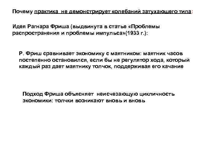 Почему практика не демонстрирует колебаний затухающего типа: Идея Рагнара Фриша (выдвинута в статье «Проблемы распространения и проблемы импульса» (1933 г. ): Р. Фриш сравнивает экономику с маятником: маятник часов постепенно остановился, если бы не регулятор хода, который каждый раз дает маятнику толчок, поддерживая его качание Подход Фриша объясняет неисчезающую цикличность экономики: толчки возникают вновь и вновь