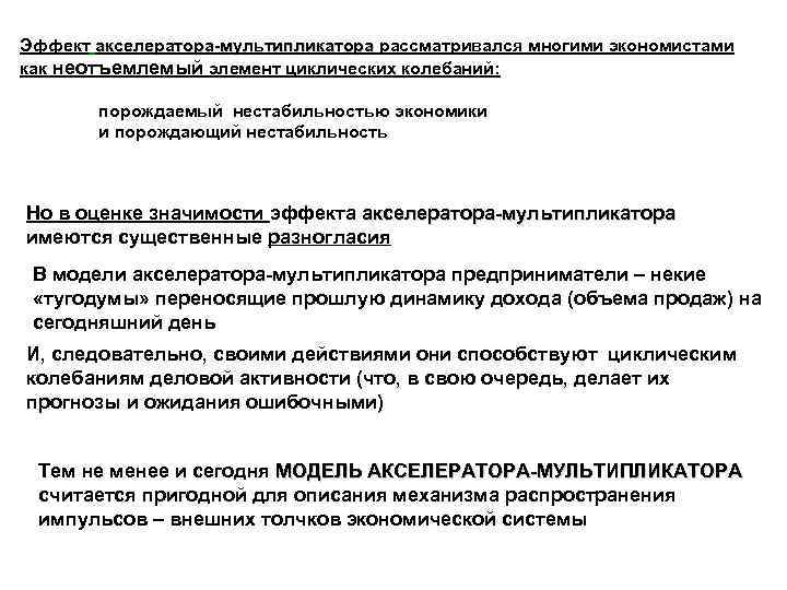 Эффект акселератора-мультипликатора рассматривался многими экономистами акселератора-мультипликатора как неотъемлемый элемент циклических колебаний: порождаемый нестабильностью экономики и порождающий нестабильность Но в оценке значимости эффекта акселератора-мультипликатора имеются существенные разногласия В модели акселератора-мультипликатора предприниматели – некие «тугодумы» переносящие прошлую динамику дохода (объема продаж) на сегодняшний день И, следовательно, своими действиями они способствуют циклическим колебаниям деловой активности (что, в свою очередь, делает их прогнозы и ожидания ошибочными) Тем не менее и сегодня МОДЕЛЬ АКСЕЛЕРАТОРА-МУЛЬТИПЛИКАТОРА считается пригодной для описания механизма распространения импульсов – внешних толчков экономической системы