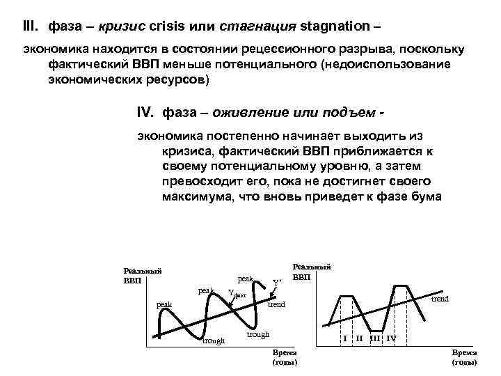Другой подход к анализу цикла: в экономическом цикле выделяют 4 фазы: I фаза – бум boom – boom экономика достигает максимальной активности. Это период сверхзанятости (экономика находится выше уровня потенциального объема производства, выше тренда) и инфляции. Экономика в этом состоянии носит название «перегретой» «overheated economy» II фаза – спад recession или slump – экономика постепенно возвращается к уровню тренда (потенциального ВВП), уровень деловой активности сокращается, фактический ВВП доходит до потенциального, а затем начинает падать ниже тренда, что приводит экономику к фазе кризиса Реальный Реальный ВВП peak ВВП Y* peak Yфакт trend peak trend trough I II IV trough Время (годы)