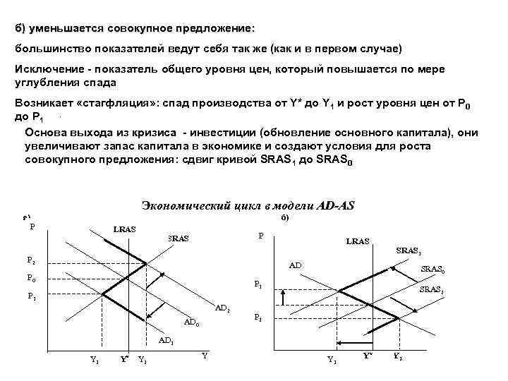 б) уменьшается совокупное предложение: большинство показателей ведут себя так же (как и в первом случае) Исключение - показатель общего уровня цен, который повышается по мере углубления спада Возникает «стагфляция» : спад производства от Y* до Y 1 и рост уровня цен от Р 0 до Р 1. Основа выхода из кризиса - инвестиции (обновление основного капитала), они Основа выхода из кризиса увеличивают запас капитала в экономике и создают условия для роста совокупного предложения: сдвиг кривой SRAS 1 до SRAS 0 Экономический цикл в модели AD-AS а) б) P LRAS SRAS P LRAS SRAS 1 P 2 AD SRAS 0 P 0 P 1 SRAS 2 P 1 AD 2 P 2 AD 0 AD 1 Y 1 Y* Y 2 Y 1 Y* Y 2