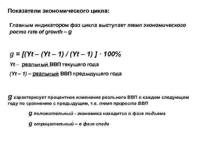 Показатели экономического цикла: Главным индикатором фаз цикла выступает темп экономического роста rate of growth – g g = [(Yt – 1) / (Yt – 1) ] · 100% Yt – реальный ВВП текущего года (Yt – 1) – реальный ВВП предыдущего года g характеризует процентное изменение реального ВВП в каждом следующем году по сравнению с предыдущим, т. е. темп прироста ВВП g положительный - экономика находится в фазе подъема g отрицательный – в фазе спада