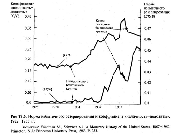 Мультипликатор и Великая Депрессия M 2 1929 26, 5 1933 19, 0 3, 9 5, 5 Вклады 22, 6 13, 5 Денежная база 7, 1 8, 4 Наличные 3, 9 5, 5 В банках 3, 2 2, 9 Мультипликатор 3, 7 2, 3 Резервы/вклады 0, 14 0, 21 Наличные/вклады 0, 17 0, 41 Наличные Источник: N. G. Mankiw, “Macroeconomics”, стр. 489, M. Friedman and A. Schwartz, A Monetary History of the United States, 1867 -1960 (Princeton University press, Princeton, 1963)