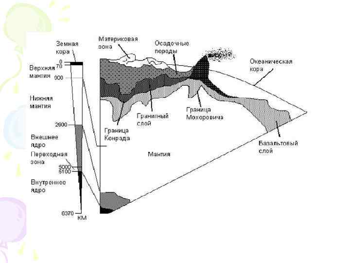 • Согласно современным представлениям, в составе мантии преобладает сравнительно небольшая группа химических элементов: Si, Mg, Fe, Al, Ca и O. Внутреннее (твердое) и внешнее (жидкое) ядра Земли состоят не только из металлического железа, но также содержат Si, O, S и даже водород. Новые научные данные позволяют говорить о том, что жидкое ядро Земли больше похоже на желе, чем на жидкость (т. е. имеет достаточно большую вязкость). По мере продвижения к центру Земли вязкость увеличивается, и желе переходит в твердое тело, но не кристаллическое (как предполагалось ранее), а аморфное (т. е. внутреннее твердое ядро на основе железа является стеклом).