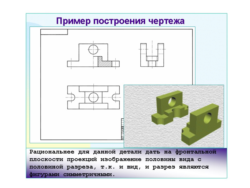 Если соединяется половина вида и половина разреза, каждый из которых является симметричной фигурой, то разделяющей линией служит ось симметрии. При соединении части (половины) вида с частью (половиной) разреза обозначение наносят по общим правилам обозначения простых разрезов.
