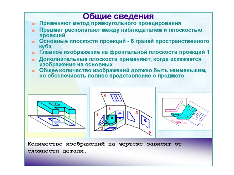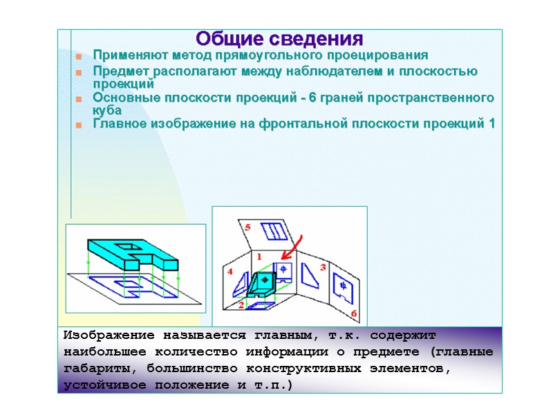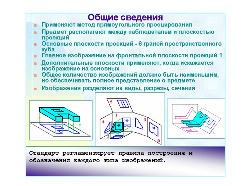 4 – вид справа 5 – вид снизу 6 – вид сзади Стандарт устанавливает следующие названия видов, получаемых на основных плоскостях проекций: 1 – вид спереди (главный вид) 2 – вид сверху 3 – вид слева ОСНОВНЫЕ ВИДЫ.