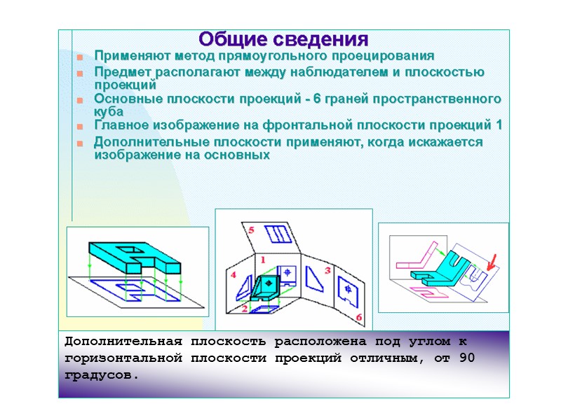 Дополнительные виды получают на плоскостях, не параллельных основным плоскостям проекций, например, дополнительный вид А. Для удобства чтения чертежа дополнительный вид допускается поворачивать, при этом к надписи должен быть добавлен знак, заменяющий слово «повернуто».
