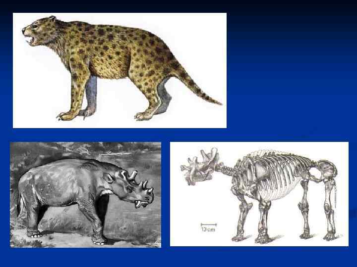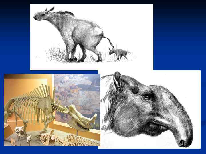 Непарнокопытные, видимо, произошли от кондиляртров семейства Phenacodontidae. Этот малочисленный нынче отряд в прошлом даже Phenacodontidae. превосходил по разнообразию парнокопытных. Уже самые ранние непарнокопытные имели трехпалые задние конечности, будучи более продвинутыми по этому признаку, чем современные им парнокопытные. Древнейшие известные непарнокопытные – лошадееобразное Hiracotherium, тапироид Homogalax и халикотероид Paleomoropus. Hiracotherium, Paleomoropus. Представители подотряда Tapiroidea на протяжении всей его истории сохраняли брахиодонтные (короткокоронковые) зубы. В (короткокоронковые) противоположность современным тапирам с архаичными пропорциями свиньи, эоценовое азиатское семейство Lophialetidae обладало телосложением газелей. Примитивные представители подотряда Rhinocerotoidea уже отличаются от тапиров более высокими коронками зубов. В прошлом существовало большое количество семейств носорогообразных, включая свиноподобных Aminodontidae и огромных Indricotheriidae с носорогообразных, пропорциями тела, приближающимися к жирафовым. Подотряд Bronthotherioidea известен исключительно из эоцена и олигоцена Северной Америки и Азии. Поздние его представители превышали по размерам современных носорогов и обладали двумя костными рогами на носовых костях. Представители подотряда Chalicotheroidea – копытные, меньше всего похожие на копытных. На ногах у них были не копыта, а мощные когти, а задние ноги были в полтора раза короче передних. Скорее всего, они питались листвой деревьев, подтягивая ветки ко рту передними конечностями и стоя при этом на задних. В Азии и Африке они дожили до плейстоцена. Подотряд Equoidea включал за свою историю множество эволюционных линий, специализировавшихся как на щипании травы, так и на объедании листьев. Не все они, в противоположность современному семейству лошадиных, приобретали гипсодонтные (высококоронковые) зубы и стройное телосложение. Олигоценовый отряд Embrithopoda, представленный одним лишь египетским родом Arsinoitherium, относится к группе отрядов копытных Embrithopoda, Arsinoitherium, африканского происхождения, к которой принадлежат хоботные, даманы, сирены и трубкозубы. Арсинойтерий имел посткраниальный скелет слоновьего облика, но два огромных костных рога на носовых костях и полностью сохранившуюся примитивную зубную формулу. Отряд Desmostylia, также принадлежащий к этой группе, известен из верхнего олигоцена и миоцена северных побережий Тихого Океана. По Desmostylia, внешнему облику и размерам десмостилии несколько напоминали бегемотов, но их ноги представляли собой нечто среднее между ногами бегемота и ластами моржа. По-видимому, они питались морскими водорослями. Несколько отрядов копытных возникло и изолированно развивалось на территории Южной Америки. Многие из них были конвергентны копытным Старого Света. Litopterna известны с палеоцена по плейстоцен. Среди них представители семейства Protheriidae были исключительно похожи на лошадей. Их боковые пальцы редуцировались даже сильнее, но зубы, хотя и приобрели лофодонтное строение, оставались брахиодонтными. Это говорит о питании листьями, а не травой, как и короткая шея этих животных, не позволившая бы им без затруднения брахиодонтными. дотянуться до земли. Представители семейства Macraucheniidae имели трехпалые конечности, длинную шею и, судя по строению носовых костей, хоботок. Все продвинутые представители отряда Notoungu