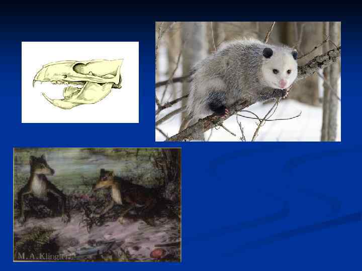 У териевых млекопитающих бугры щечных зубов расположены треугольником, так что у их истоков можно поставить кюнеотерия. У того кюнеотерия. даже был зачаточный талонид (четвертый бугор), сформированный из цингулума (пояска), и его можно включить в отряд Symmetrodonta из средней и верхней юры, характеризующийся лишь небольшим талонидом и симметричными верхними и нижними молярами. Симметродонты являются сестринской группой по отношению и к сумчатым, и к плацентарным. Существовали и другие млекопитающие (вплоть до палеоцена), которые достигли уровня организации териев, но не относились ни к сумчатым, ни к плацентарным. Предки же их териев, обоих относятся к нижнемеловому семейству Aegialodontidae. В кайнозое териевые млекопитающие заполнили пробел, образовавшийся после вымирания динозавров. Различные их эволюционные линии начали осваивать новые для млекопитающих экологические ниши. Вымирание динозавров сложно объяснить конкуренцией со стороны млекопитающих, так как оно предшествовало бурной радиации териев, а не следовала за ней. На протяжении существования териев, динозавров млекопитающие жили бок о бок с ними, образуя свой «параллельный мир» , практически не перекрывавшийся с миром динозавров. Млекопитающие – современники динозавров – были гораздо мельче большинства из них. В самом конце позднего мела уже наблюдалось сильное оскудение фауны динозавров, разнообразие же млекопитающих из тех же пунктов не уступало разнообразию динозавров. Конкурентные отношения между млекопитающими и молодью динозавров в чистом виде маловероятны, поскольку для динозавров известна забота о потомстве. Основополагающие и легко диагностируемые различия между сумчатыми и плацентарными относятся к составу щечных зубов. Примитивная зубная формула сумчатых – 5134 / 4134, такова она и у современных опоссумов. Древнейшие сумчатые известны из верхнего мела Северной Америки, и все они относятся к опоссумам (в широком смысле этого слова). В эоцене сумчатые проникли в Евразию. В основном они радиировали в Южную Америку, а когда они попали в Австралию – не известно (там они не встречаются в слоях древнее верхнеолигоценовых). Представители семейства Borhyaenidae, существовавшие с нижнего палеоцена по верхний плиоцен – более специализированы хищные Borhyaenidae, сумчатые, чем опоссумы. Их зубная формула 4134 / 3134, моляры сжатые с боков и режущие, как у плацентарных хищников. Ноги короткие, не приспособленные к быстрому бегу. По размерам они достигали медведя. От боргиенид произошли Thylacosmilidae (верхний миоцен – верхний плиоцен). Они представляли собой экологический эквивалент саблезубых тигров. Их огромные верхние клыки, чьи корни шли даже по верх лба, обладали постоянным ростом. Резцы утрачены, а на нижней челюсти под верхними клыками находились выступы, выполнявшие функцию «ножен» . Вымирание тилакосмилид нельзя связать с проникновением в Южную Америку настоящих саблезубых тигров, которое произошло только в плейстоцене. Эоценовое семейство Groeberiidae и олигоценово – плиоценовое семейство Argyrolagidae – аналоги грызунов среди южноамериканских сумчатых. Их зубные формулы соответственно 2004 / 1004 и 2014 / 2014. Резцы покрыты эмалью только спереди, все зубы с постоянным ростом. Аргиролагиды – аналоги тушканчиков. Задние ноги у них очень длинные, двупалые; берцовые кости срослись дистально, 