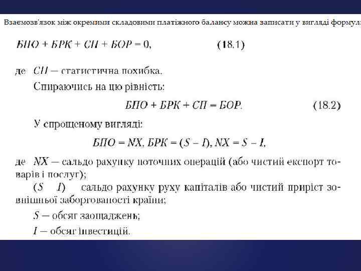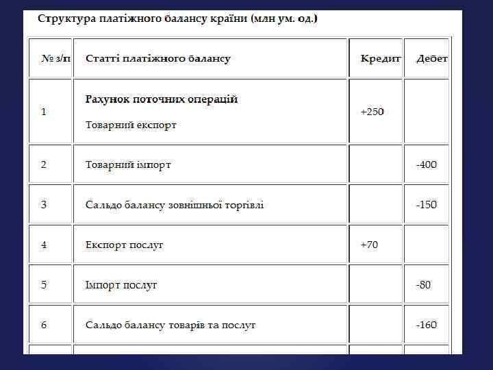 ЗАГАЛЬНІ УМОВИ, ЩО ПОВИННІ ВИКОНУВАТИСЯ ДЛЯ ДОСЯГНЕННЯ РІВНОВАГИ ПЛАТІЖНОГО БАЛАНСУ: • Нульове сальдо, тобто рівність дебету та кредиту в базисному балансі чи балансі офіційних розрахунків • Повна зайнятість по країні • Відсутність серйозних обмежень на міжнародні операції