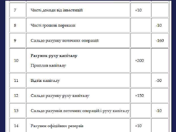 Будь-яка операція, що призводить до платежу, проведеного громадянами даної країни (чи урядом), є витратною статтею балансу ( –), а та, що веде до отримання громадянами країни (чи урядом) коштів, є прибутковою статтею балансу (+)