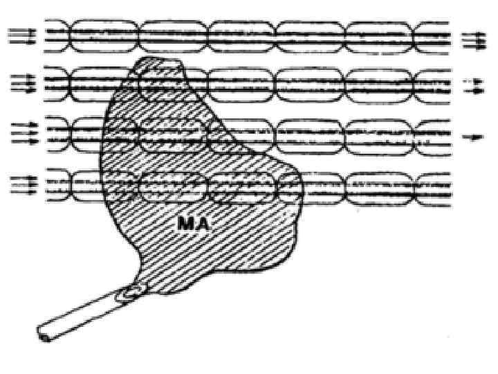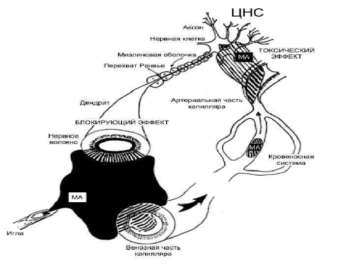 • Эффект анестезии зависит не только от концентрации МА, достигшей нервной мембраны, но и величины участка, смачиваемого лекарственным раствором • В миэлиновых волокнах местом действия МА является только перехват Ранвье. • Нервный импульс может перескочить через 1 и 2 анестезированных перехвата, и для полной блокады нерва необходимо, чтобы 3 перехвата были смочены МА в эффективной концентрации (рис