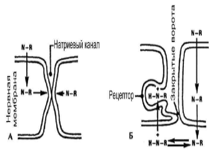 Два механизма, объясняющие местную анестезию. А. Физикохимический механизм. На диаграмме А свободное основание MA (N-R) входит в слой липидной нервной мембраны. Когда достаточное количество МА накапливается в ней, происходит боковая деформация натриевого канала, нарушающая проницаемость натриевого канала Б. Рецепторный механизм. Свободное основание (N-R) проходит через мембрану внутрь клетки. Там происходит диссоциация свободного основания с образованием катионной формы (H-N+-R). Последняя входит в водный натриевый канал, где соединяется с рецептором. При этом закрываются ворота натриевого канала и нарушается его проницаемость (Cangarosa L. P. et al. , 1983).