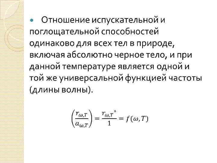 Закон Кирхгофа Равновесие в системе может установиться только в том случае, если каждое тело будет излучать в единицу времени столько же энергии, сколько оно поглощает. Это означает, что тела, интенсивнее поглощающие излучение какой-либо частоты, будут это излучение интенсивнее и испускать.