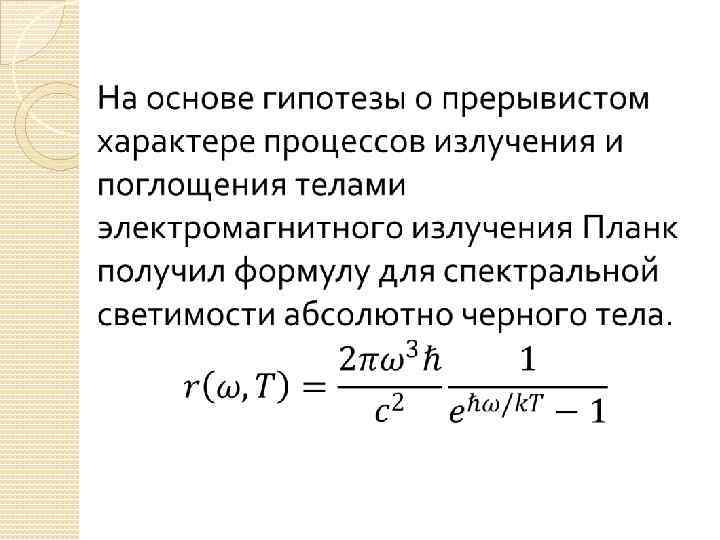 Распределение М. Планка Решить задачу о спектральном распределении излучения абсолютно черного тела в рамках существующих теорий невозможно. Эта задача была успешно решена М. Планком на основе новой идеи, чуждой классической физике. Планк пришел к выводу, что процессы излучения и поглощения электромагнитной энергии нагретым телом происходят не непрерывно, как это принимала классическая физика, а конечными порциями – квантами.