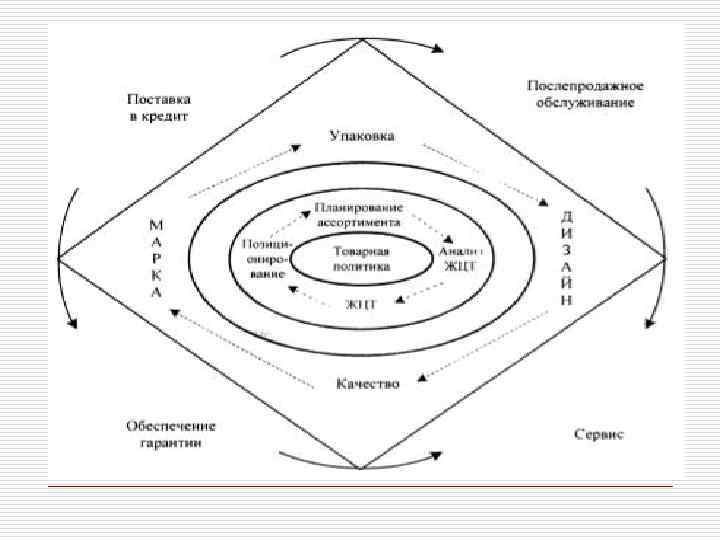 Товарная политика o Потребителям выгодно получить из одних рук не только товар как таковой, но и весь комплекс сопровождающих этот товар услуг с тем, чтобы без особых забот и излишних затрат получить высокий конечный эффект от использования купленного товара. Чем полнее шлейф сопровождающих основной товар сопутствующих изделий и услуг, тем привлекательнее для покупателя становится не сам товар как таковой, а весь комплекс, позволяющий предельно полно удовлетворить существующую потребность.