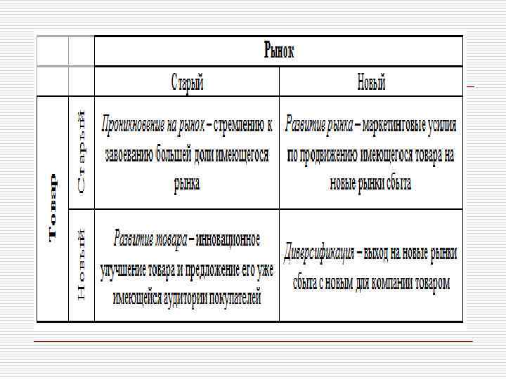 Товарная политика o Стратегии принятия решений в товарной политике могут быть представлены в виде матрицы Ансоффа, по типу «товар – рынок» (представлены на след. слайде).