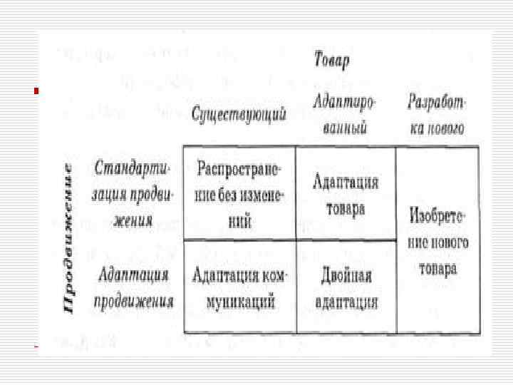 Товарная политика o Диверсификация выступает как эффективное средство для обеспечения роста устойчивости деятельности фирмы. При проведении диверсификации возможно изменение как товара, так и рынков или их комбинации. o Диверсификация применяется, когда фирма начинает производить дополнительные товары, которые планируется предложить на новые рынки сбыта.