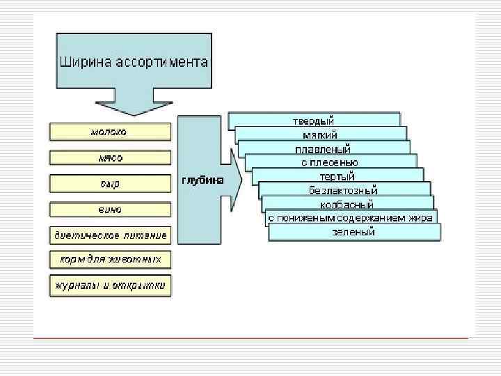 Основные характеристики ассортимента товара o Решение относительно широты ассортимента. Ассортимент слишком узок, если можно увеличить прибыль, дополнив его новыми изделиями, и слишком широк, если прибыль можно увеличить, исключив из него ряд изделий. o Широта товарного ассортимента отчасти определяется целями, которые фирма ставит перед собой.