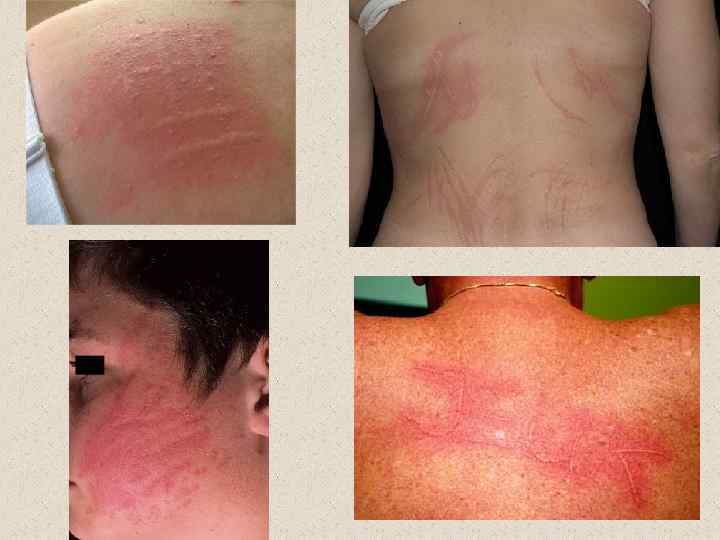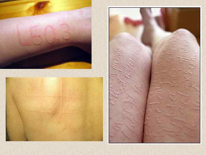 Дермографи зм (греч. derma кожа + graphō писать, изображать) Местное изменение окраски кожи при ее механическом раздражении. Различают местный и рефлекторный Д. Местный Д. можно вызвать проведением по коже тупым концом палочки диаметром 2— 3 мм. Обычно через 8— 20 с, иногда несколько позже, появляется белая полоса (белый Д. ), которая исчезает через 1— 10 мин. При большем давлении на кожу через 5— 15 с возникает красный Д. , который может сохраняться до 2 ч. Белый и красный Д. обусловлен механическим раздражением стенок капилляров. При этом слабое раздражение вызывает спазм капилляров (белый Д), а более сильное — расширение капилляров (красный Д).