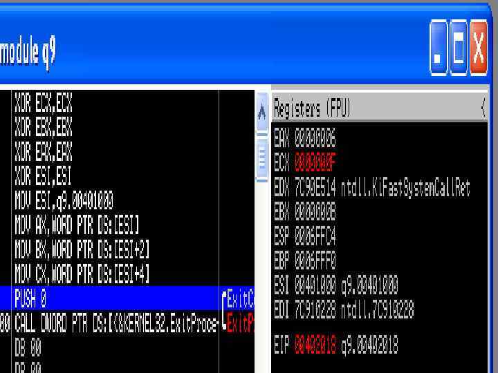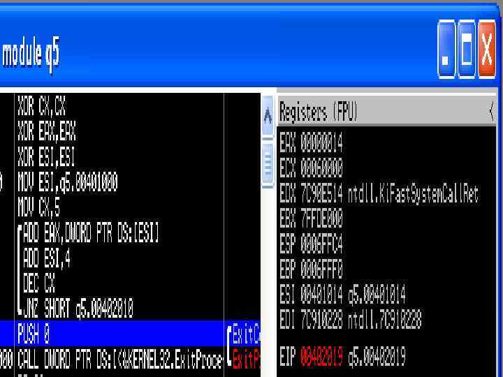 ; q 9. asm include 'win 32 ax. inc'. data a dw 6, 11, 15, -7, 1. code start: xor ecx, ecx xor ebx, ebx xor eax, eax xor esi, esi mov mov esi, a ax, [esi] bx, [esi+2] cx, [esi+4] invoke Exit. Process, 0. end start