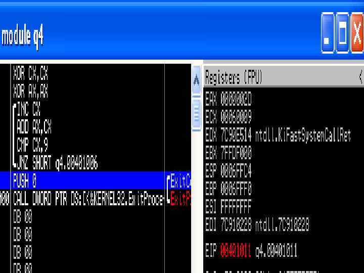 ; q 4. asm ; Сумма цифр от 1 до 9 include 'win 32 ax. inc'. code start: xor cx, cx xor ax, ax begin: inc cx add ax, cx cmp cx, 9 h jne begin exit: invoke Exit. Process, 0. end start