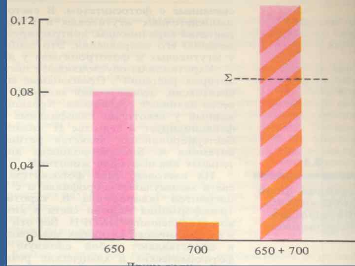 • Эмерсон эффектісі. • 680— 700 нм ұзындығы бар толқындардың тиімділігін ұлғайту үшін ұзыныдығы қысқа (650— 660 им) толқындарды қосу керегін Р. Эмерсон көрсеттті. • Фотосинтездің тиімділігі аралас сәулемен сәулеленгенде (екі ұзындығы бар сәуле) әр біреуімен бөлек сәулеленген фотосинтездің тиімділігінен жоғары болды. • Бұл құбылысты ұлғайтатын Эмерсон эффектісі деп атайды.