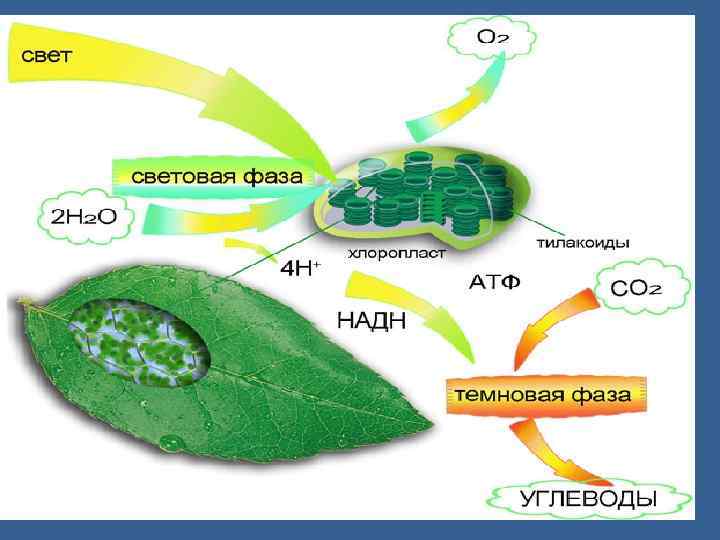 • 1 және 1. 2 фотожүйелер. Циклдік және циклсіз электрон тасмалдау жолдары. • Фотосинтездің фотохимиялық реакциялары – күн сәулесінің энергиясы химиялық байланыстардың энергиясына айналу реакциялары, біріншіден фосфорлық байланыстардың энергиясына айналу. • АТФ – энергетикалық валюта болып саналады, ол барлық процестердің жүруін қамтамасыз етеді. • Күн сәуле әсерінен су ыдырайды да, тотықсызданған НАДФ түзіледі, оттегі бөлінеді.