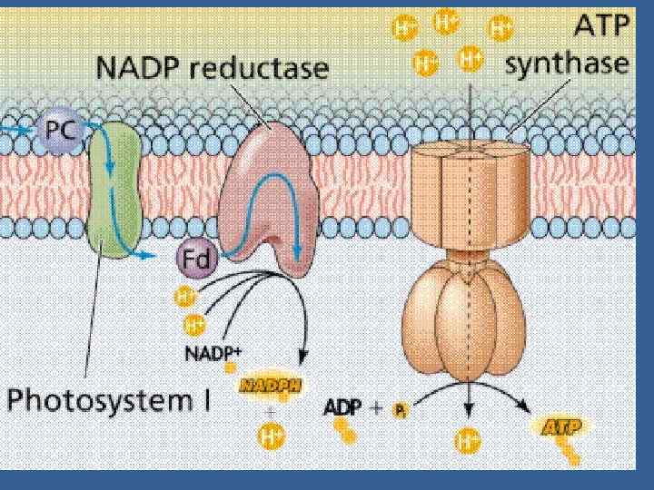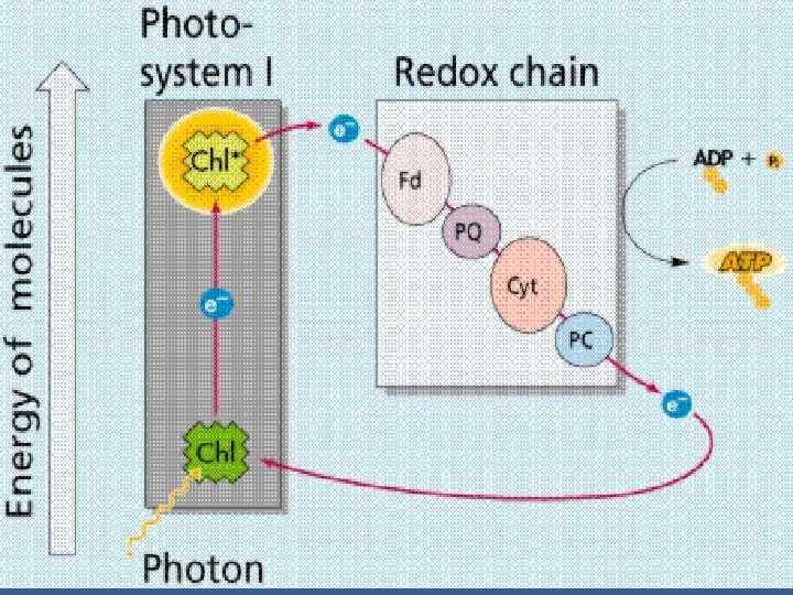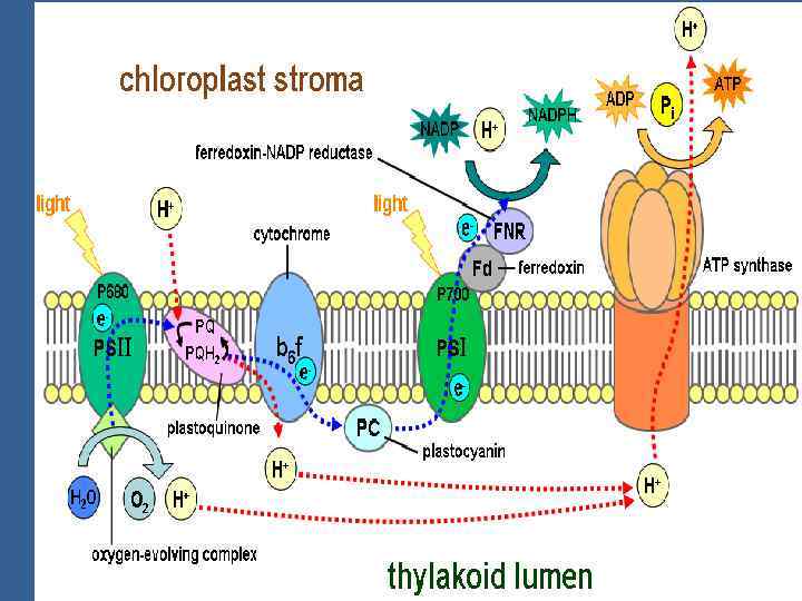 • ФЖ 1 – НАДРН • ФЖ 2 – О 2 Электрон тасмалдағыш тізбек екі фотожүйені байланыстырады белок цитохромдық пластохинондық комплекс (фонд), б – f комплекс және пластоцианин.