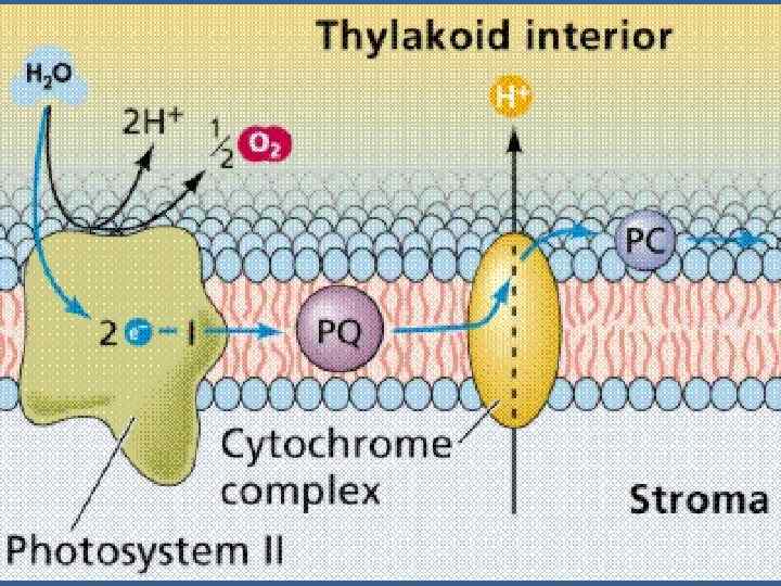 • Сәуленің 2 квантын сіңіргенде 2 эл н (кезекпен) П 680 нен шығып, мембранадан өтеді, орынына электрондар судан келеді. • Онда протондар судан тилакоидтардың ішкі кеңістігіне шығады; ал оттегінің атомы хлоропласттан шығып кетеді