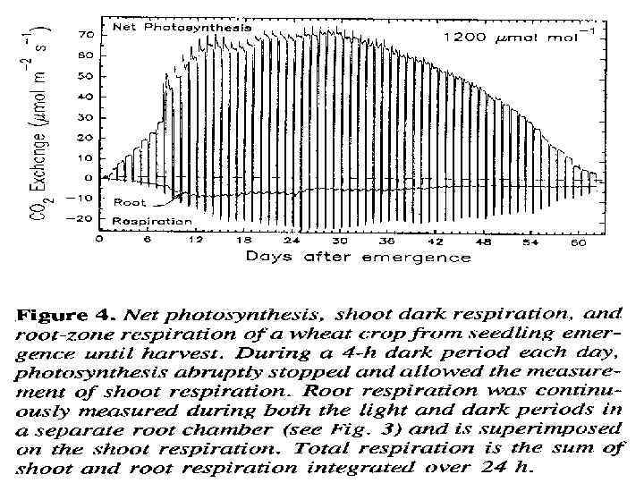 • Измеряется раздельно потоки углерода в корнях и надзем. Органах • Нетто фотосинтез /на квад. М горизонт. Площади/ был низкий во время раннего роста так как было незаконченным абсорбция PPF достиг. Плато через 10 дней после прорастания и убывает после 40 дней по мере старения листьев во время последующего цветения. • Дыхание корней быстро увеличивается до макс. 10 мк. М/ кв. м (площади растущей. Поверх. ) / s и стабилизируется рано в жизненном цикле.