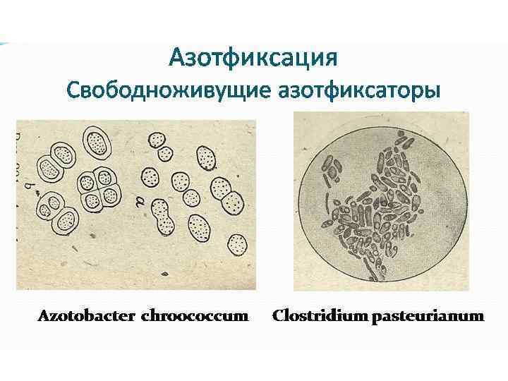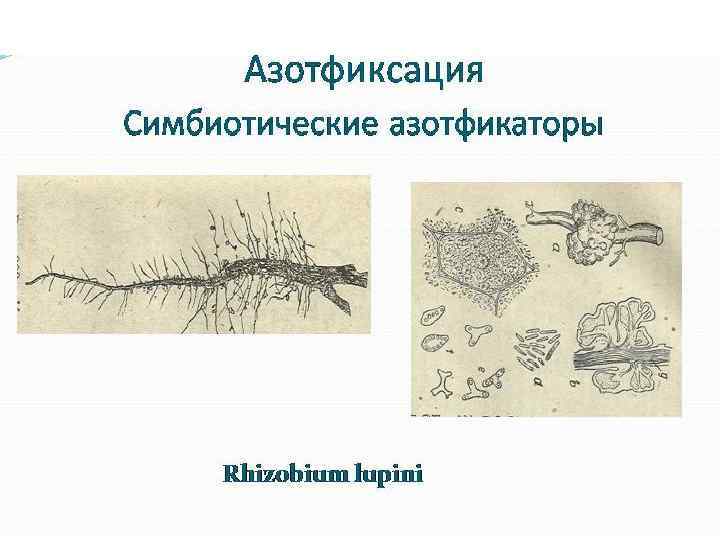 Типы питания микроорганизмов Азотфиксаторы восстанавливают азот атмосферы в аммиак, который используется в биосинтетических процессах. • Свободноживущие: ü Аэробные – Azotobacter ü Анаэробные - Clostridium pasteurianum. Они в качестве источника азота могут усваивать соли аммония, нитраты, нитриты и аминокислоты. Но если связанные формы отсутствуют или находятся в недостатке, то они переходят на процесс азотофиксации. К активным азотфиксаторам относятся цианобактерии (синезеленые водоросли). • Симбиотические азотофиксаторы ü клубеньковые бактерии. Усваивают азот в симбиозе с бобовыми растениями. Роль азотофиксаторов в природе - обеспечивают почву и водоемы соединениями азота.