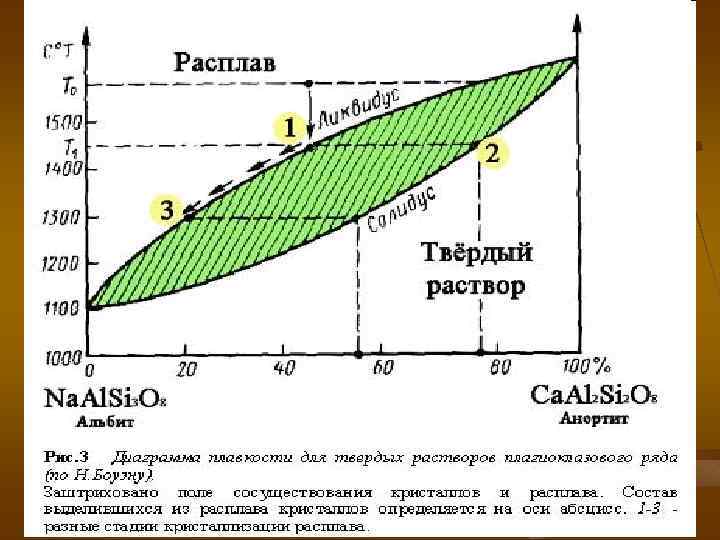Кристаллизация магмы – превращение в горную породу Кристаллизация магмы происходит не мгновенно, а постепенно, с одновременным падением температуры. Возможны несколько вариантов: В 1 -ом из них охлаждение происходит очень быстро, расплав переохлаждается и превращается в вулканическое стекло – обсидиан (точки 0→ 1→ 6). 2 -ой вариант связан с медленным охлаждением и кристаллизацией расплава. На диаграмме состояния линия, соединяющая точки, где в расплаве появляются первые кристаллы, называется ликвидусом, а линия, соединяющая точки, где полностью исчезает расплав - солидусом. Между этими линиями находится поле сосуществования расплава и кристаллов.