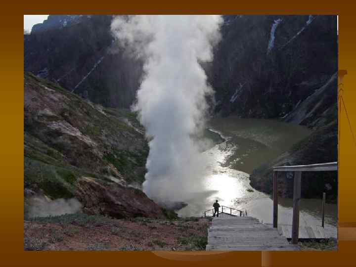 Поствулканические явления После извержений, когда активность вулкана либо прекращается навсегда, либо он только "дремлет" в течение тысяч лет, на самом вулкане и в его окрестностях сохраняются процессы, связанные с остыванием магматического очага и называемые поствулканическими. Выходы вулканических газов на поверхность называются фумаролами (от лат. "фумо" - дым). Фумаролы подразделяются на сухие высокотемпературные, кислые, щелочнонашатырные, сернистые, или сероводородные (сольфатары, итал. "сульфур" сера), углекислые (мофеты, от итал. "мофетта" - место зловонных испарений). Горячие источники, или термы, широко распространены в областях современного и новейшего (плиоцен-четвертичного) вулканизма. Однако не все термы связаны с вулканами, так как с глубиной температура увеличивается и в районах с повышенным геотермическим градиентом циркулирующая атмосферная вода нагревается до высоких температур. Гейзеры - это горячие источники, вода которых периодически фонтанирует и выбрасывается вверх на десятки метров.